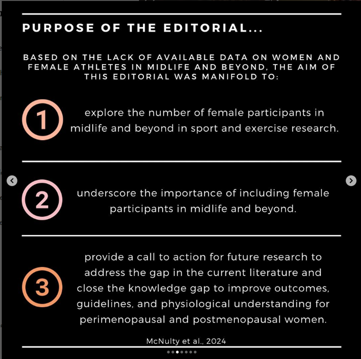While studies in midlife men as participants may also be similarly low and warrant further investigation, in this editorial, we examine the inclusion of female participants in midlife and beyond in sport and exercise science research, highlight the need to include female participants in the midlife and beyond and provide a call to action for researchers in this area to bridge the current data and knowledge gap for perimenopausal and postmenopausal women.