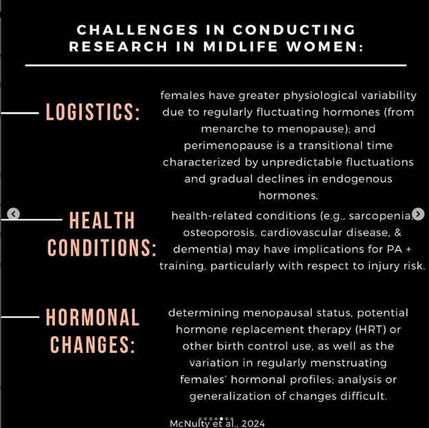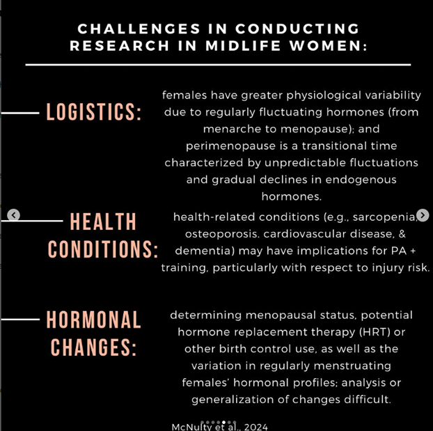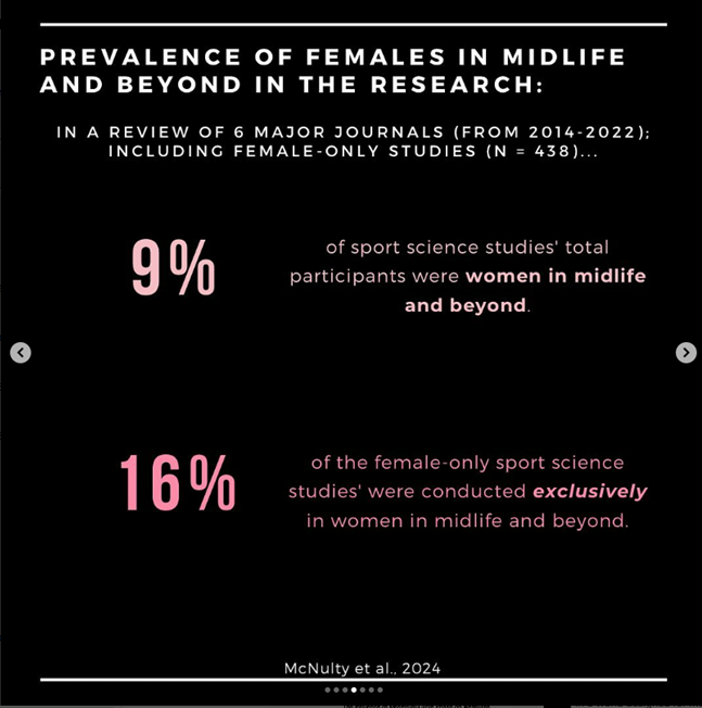 However, it is likely that these numbers would be further reduced when investigating the representation of women in midlife and beyond (ie, those who are perimenopausal or post-menopausal) within these female- only studies.